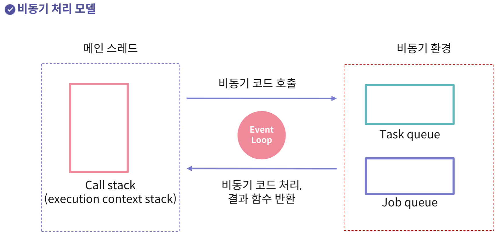 - 비동기 처리는 우선순위가 가장 높은 JobQueue에서 작동하며, 요청 처리 후 TaskQueue에 비동기 응답을 처리하는 Callback 함수를 넣는다.