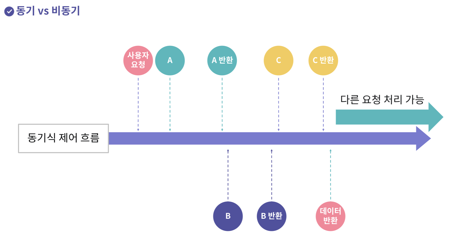 프로그래밍 언어는 동기 적으로 동작한다. '동기적 처리'의 사전적 의미로는 '작업의 요청과 결과가 같은 시간에 발생한다'로 작업이 시작되면 작업이 끝날 때까지 해당 작업의 결과를 기다리는 것을 의미한다. 아래의 그림처럼 먼저 시작된 A가 반환된 이후 B가 실행되는 것이다. A의 수행이 오래 걸린다면 B의 시작도 늦어진다.